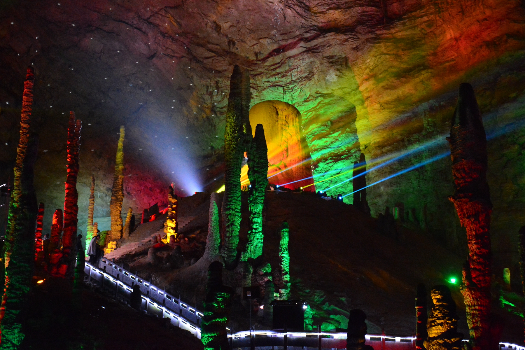 • 黃龍洞,一座形成于3.8億年前的大自然的迷宮,高闊的洞天,幽深的暗河,懸空的瀑布,密集的鐘乳石,匯聚成氣勢雄偉的洞穴大觀。目前,黃龍洞已探明的洞底總面積是10萬平方米,全長7.5公里,垂直高度140米,內(nèi)分兩層旱洞和兩層水洞。