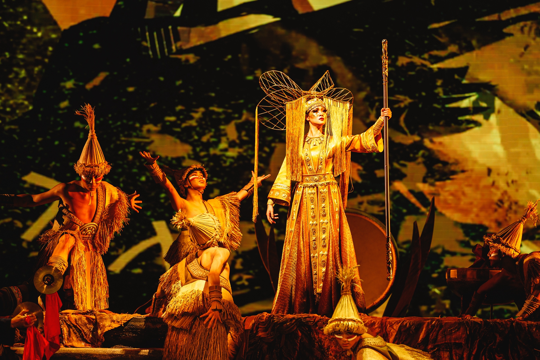 強勁的節(jié)奏在祠堂上空響起,赤裸上身、身著原始草裙的村民肅立成陣,跳起了土苗民族的茅古斯舞;舞臺中心的升降臺載著裝扮華麗神秘的女祭司慢慢升起,作為這場儀式的指揮,她的吟唱仿佛統(tǒng)領(lǐng)著整個森林山谷中的所有神力......